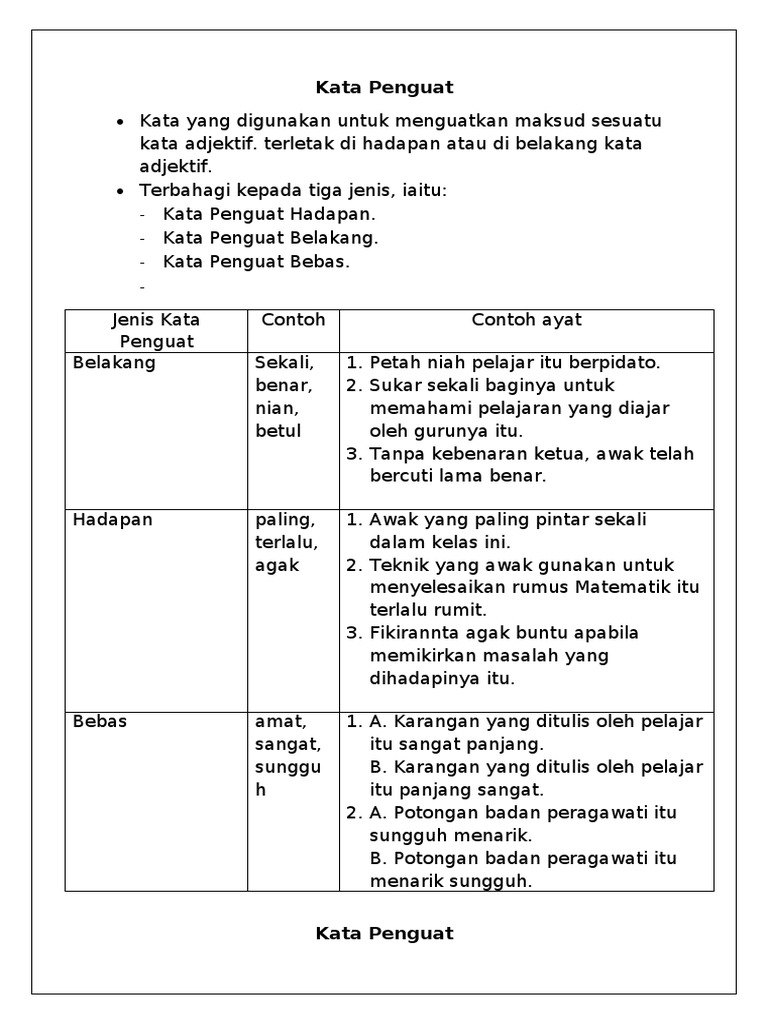 Nian sekali CONTOH AYAT KATA PENGUAT BELAKANG Sukar sekali baginya untuk memahami pelajaran yang diajar oleh gurunya itu. Pokok di belakang rumah Rahman terlalu rendang. Stephane Henchoz kian digugurkan daripada kesebelasan utama.